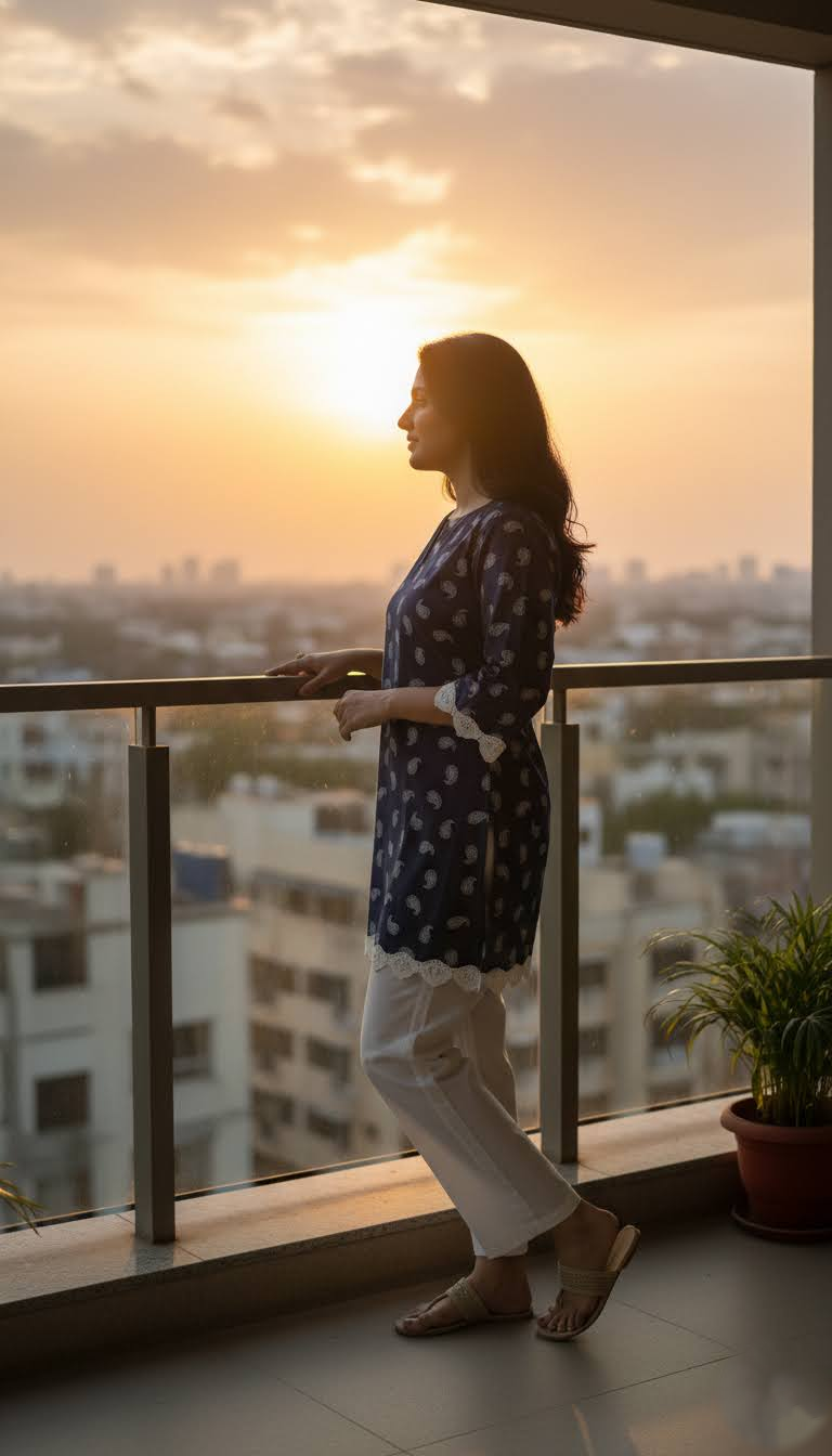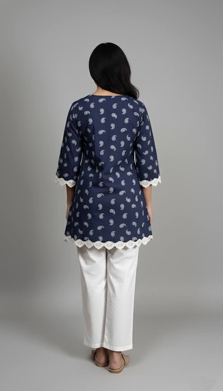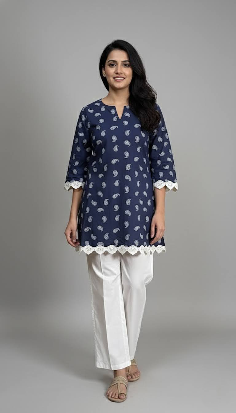 Tailored from 100% breathable cotton, Indira features a rich indigo hue adorned with delicate white paisley motifs. The handcrafted lace detailing at the sleeves and hem adds a timeless charm, blending everyday comfort with understated elegance.